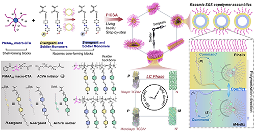 图2.分步聚合诱导手性自组装(PICSA)策略制备消旋S&S液晶共聚物组装体