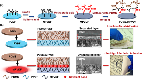 膜分离技术作为高效节能的共性关键技术受到广泛关注;其中,薄膜复合(TFC)膜基于分离选择层与支撑基底的功能性复合膜结构,在生物能源、生物医药、废水处理等领域发挥着重要作用。然而,传统TFC结构中选择层与支撑基底之间常为物理相互作用,存在界面黏附力差、易溶胀而造成剥离等问题,损失膜性能、缩短寿命;特别是在应对高温、高溶剂浓度或高固含物等极端条件时,层间结构稳定性依然是个挑战。研究团队前期通过层间分子结构设计,制备了超界面稳定的PDMS/PAN复合膜(Materials Horizons 2024,11, 4681-4688),取得一定的成效;相较而言,PVDF因出色的疏水性更适配PDMS TFC膜,但其固有的化学惰性对定向化学修饰是个挑战。