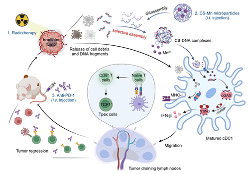 有鉴于此,苏州大学冯良珠教授和刘庄教授团队最新研究结果表明,利用壳聚糖分子与锰离子之间的配位做合成了具有在复杂生理条件下选择性捕获DNA能力的锰-壳聚糖(CS-Mn)微粒,用于提高放射治疗激活cGAS-STING的能力。体外实验结果显示,在水溶液中具有良好稳定的CS-Mn微粒一旦加入生理溶液中则快速解离释放线性壳聚糖分子,后者利用与DNA分子之间强烈的静电相互可以在血清等复杂生理溶液中形成带正电的DNA-CS配合物,进而显著增强DNA分子的入胞效率,并与Mn2+协同激活树突状细胞中的cGAS-STING通路并提升其抗原交叉呈递能力。将其注射到肿瘤内后,CS-Mn微粒协同局部放疗释放的DNA激活瘤内cGAS-STING细胞通路,显著提高瘤内CD8+T细胞和前体耗竭型TCF-1+PD-1+CD8+T细胞,显著提高对不同肿瘤模型中原发瘤(射线照射)和远端瘤(未照射)的抑制效果,与anti-PD-1免疫检查点阻断疗法联合后还能抑制肿瘤全身转移(图1)。这项工作报道了一种在复杂生理条件下具有高选择性捕获DNA片段能力的特洛伊木马样锰-壳聚糖微粒用于增效放射免疫联合治疗研究。相关工作以“DNA-Capturing Manganese-Coordinated Chitosan Microparticles Potentiate Radiotherapy via Activating the cGAS-STING Pathway and Maintaining Tumor-Infiltrating CD8+ T-Cell Stemness”为题发表在Advanced Materials上。文章的第一作者为苏州大学功能纳米与软物质研究院的硕士研究生张帅,通讯作者为冯良珠教授和刘庄教授。