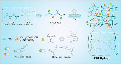 图1基于苯硼酸改性羧甲基壳聚糖的多功能CBT水凝胶的制备示意图