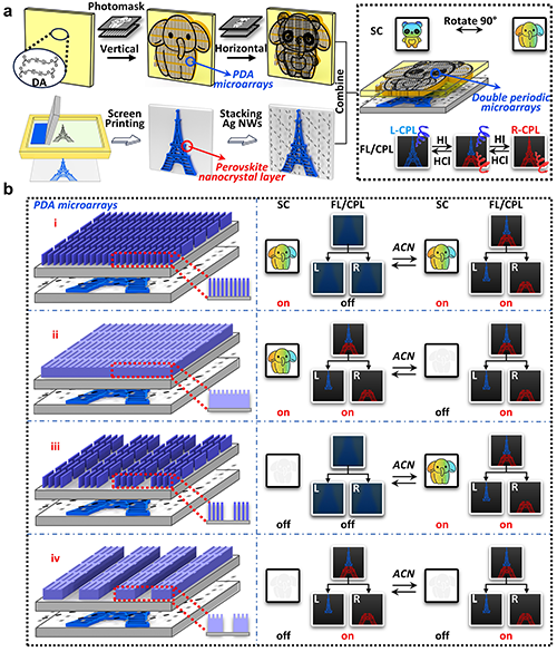 下层手性荧光层为钙钛矿纳米晶叠加螺旋堆叠银纳米线阵列(TNA)。螺旋堆叠使非手性钙钛矿(CsPbX3, X = Cl, Br, I )荧光层产生CPL信号,发光不对称因子最高可达±1.3,借助左/右旋圆偏振滤光片(CPF)可实现手性的裸眼识别。钙钛矿纳米晶体中的卤素阴离子交换可用于进一步调节其荧光信息,包括圆偏振荧光颜色和手性方向。