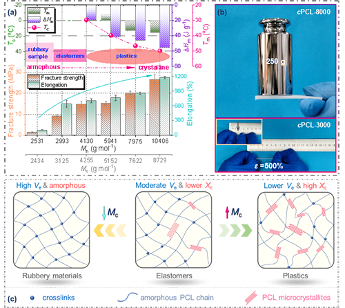 脂肪族聚酯如聚乳酸、聚己内酯、聚丁二酸丁二酯等因良好的生物可降解和生物相容性在生物医疗领域备受关注。大量的研究工作聚焦于共聚/共混/填充改性,以拓展这一类热塑性聚酯材料的应用场景,或满足不同植入器件的需求,鲜有从热固性树脂的角度对这一类聚酯材料进行结构设计以拓宽宏观性能和力学状态的边界。扬州大学的吴德峰教授团队在基于天然果酸的热固性聚酯研究的基础上(Polymer 2021, 221, 123628, J. Mater. Chem. A 2020, 8, 17193, ACS Appl. Mater. Interfaces 2020, 12, 1672),将生物质来源的聚多元酸/醇与聚乳酸、聚己内酯等进行酯交换,不仅丰富了可降解聚酯材料的结构设计方法,还赋予了体系刺激响应的能力(Macromolecules, 2021, 54, 5694)。这一类热固性聚酯中具有多层次的网络结构,因此锚定网络的形态与结构对于宏观性能的设计至关重要。基于此,吴德峰教授团队设计了一个模板体系:采用苹果酸寡聚物作为交联剂,不同臂长的多臂聚己内酯作为网络主体结构单元,制备了一系列不同网格间距的共聚酯,随后通过材料热、力学性能的研究,建立了网络结构-力学状态的关系,为热固性可生物降解聚酯材料力学状态的精准调控提供了一种有效的策略。