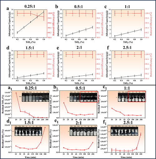 Fig. 5 (a-f)Adsorption of different ratios of SF/PA gels for different initial nanoparticles concentrations (0.2%,0.4%,0.6%,0.8%,1%,1.2%; adsorption time of 1h). (a1-f1) Residual nanoparticles content after adsorption for different times with different ratios of SF/PA gel materials (0.6% TiO2)