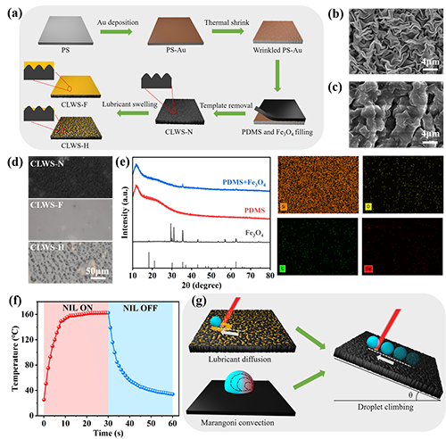 图1. Fe3O4/PDMS薄膜可控润滑剂注入表面(CLWS)的制备与表征。