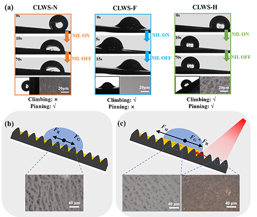 图2. CLWS倾斜表面上光驱动液滴爬升与自发固定。
