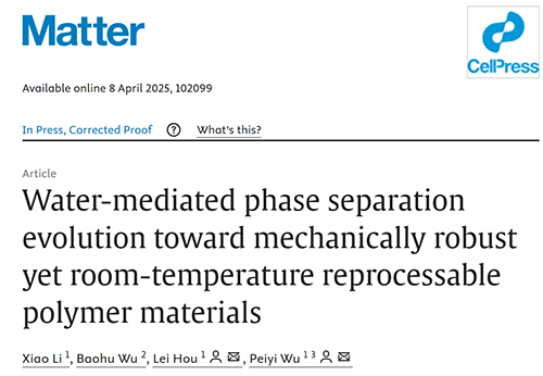 以上研究成果近期以“Water-mediated phase separation evolution towards mechanically robust yet room-temperature reprocessable polymer materials”为题发表在《Matter》上。东华大学化学与化工学院硕士研究生李啸为文章第一作者,通讯作者为武培怡教授和侯磊副研究员。