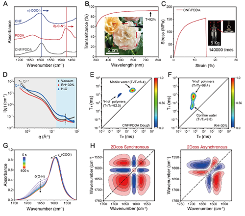 由带负电的刚性纳米纤维(CNF)和带正电的聚合物(PDDA)构成聚电解质复合物,通过高密度和多层次的静电相互作用制备出高透明且高机械性能的材料(图2)。纳米尺度的“海-岛”相分离结构有助于吸水后的增韧机制,而双连续相分离结构有助于塑料在完全水合后的面团状粘弹行为。二维相关红外光谱和低场核磁共振谱进一步验证了塑料、面团状态下,聚电解质复合物内部的多层次相互作用。