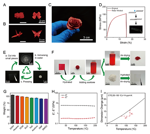 在泡水平衡后,CNF/PDDA塑料可转变为面团状材料,具有优异的愈合性和可重塑性,在室温条件下实现塑料回收利用(图4)。利用注塑、折纸和泥塑等方式可获取丰富的3D形状,并且可以通过水焊接的方式实现材料的修补。
