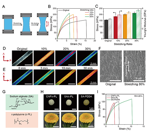 通过拉伸成型工艺将面团状材料在风干过程中保持拉伸状态,使聚合物链沿拉伸方向产生定向取向,进一步提高塑料的力学性能(图5)。此外,水介导相分离演化策略可以进一步拓展至其它聚电解质复合物体系,并基于此制备出高性能且可室温回收的可持续塑料。