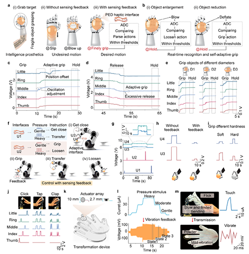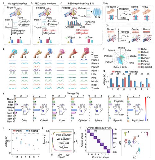 本工作提出了一种可编程事件驱动(Programmable and event-driven,PED)触觉传感器,模仿人体皮肤多层次机械感受器的响应机制,采用梯度金字塔超表面结构设计,实现对不同强度压力的高精度感知。通过逐级触发不同高度的微结构单元,有效调控上下敏感层接触面积,赋予器件优越的压力解耦与事件驱动特性,实现了压力强度的连续编码,显著延缓信号饱和的发生。PED触觉传感器展现出优异的性能,最大灵敏度达2501?kPa?1,检测范围覆盖至420?kPa,较传统均匀微结构接口分别提升了350%和300%;同时具备极低的压力检测限(2?Pa)与快速响应时间(12?ms),可灵敏识别微弱压力变化及高频动态输入,展现出卓越的实时触觉感知能力。在应用层面,本工作集成分布式PED触觉传感器构建了具备空间分辨能力的物体识别系统,通过一维卷积神经网络对抓取信号进行特征提取,实现了高达97.2%的物体轮廓识别准确率。此外,基于PED触觉传感器开发的数据手套交互系统有效突破了传统手柄交互的视觉遮挡与功能受限问题,支持多指精细控制与双向触觉通信,显著增强了虚拟环境中的沉浸感与真实感。进一步地,通过引入了基于实时压力反馈的自适应抓取机制,使机械手能够动态调节抓取策略,实现无需人工干预的高精度、无损抓取操作。