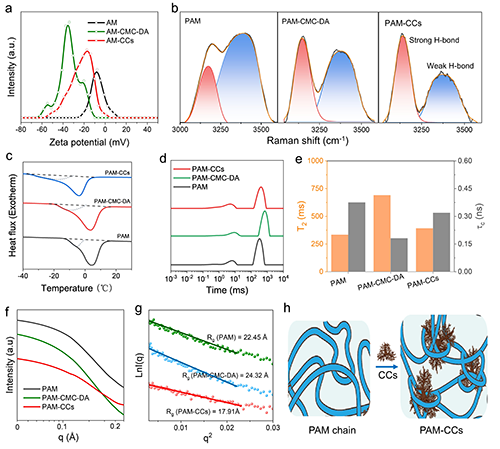 图4 a) AM、AM-CMC-DA和AM-CCs的Zeta电位;b) PAM、PAM-CMC-DA和PAM- CCs水凝胶的拉曼光谱;c) DSC曲线;d)低场核磁共振(L-NMR)曲线;e)对应的T?和τc值;f) SAXS衍射图;g) SAXS的Lnl(q)-q2(Guinier-Plot)曲线;h)加入CCs后PAM链形成高缠结的机理。