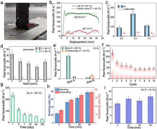 图4. PAA-co-PNIPAM/CDs 水凝胶的粘附剥离性能。(a) PAA-co-PNIPAM/CDs 水凝胶粘附剥离测试的示意图;(b) PAA-co-PNIPAM/CDs 水凝胶在空气中(T < 50°C)和水中(T > 50°C)的粘附剥离曲线;(c) 不同CDs合成时间条件下制备的水凝胶,在空气中(T < 50°C)和水中(T > 50°C)的粘附剥离强度柱状图;(d) 不同NaCl浓度溶液中,水凝胶的粘附剥离强度柱状图;(e) 水凝胶正反两面(A面与B面)在空气(T < 50°C)和水中(T > 50°C)的粘附剥离强度柱状图;(f) PAA-co-PNIPAM/CDs 水凝胶在空气中(T < 50°C)进行10个循环粘附剥离测试的强度柱状图;(g) 水凝胶在空气中(T < 50°C)存放1、3、7、15 和 30天后的粘附剥离强度柱状图;(h) 水凝胶在不同时间点的吸水膨胀和脱水收缩质量变化柱状图;(i) 完全脱水后的水凝胶在空气中(T < 50°C)的粘附剥离强度柱状图。