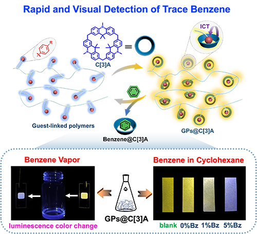 近日,中国科学院化学研究所陈传峰、韩莹团队报道了一种基于杯[3]二氢吖啶与受体键连聚合物的新型STADF材料GPs@C[3]A,其可利用发光颜色变化机制对痕量苯进行快速可视化检测,检测限量可低至3.5 mg/L。此外,GP1@C[3]A还可进一步制备成可视化且便捷的检测试纸,用于环己烷中的苯含量的检测。