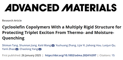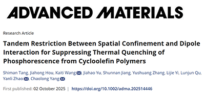 近年来,聚合物室温磷光(RTP)材料受到广泛关注和快速发展,并在众多领域展现了巨大应用潜力。然而,其RTP快速的热、湿猝灭的问题,导致了其在高温高湿环境中应用受限。因此,开发具有抗热湿猝灭性能的磷光材料十分必要。针对这一问题,重庆理工大学王凯悌副教授、杨朝龙教授联合新加坡南洋理工大学赵彦利教授,提出了一种利用刚性主链和功能侧基之间级联禁锢抑制三重态激子热失活的策略,通过物理掺杂和可控聚合手段分别制备出了一系列具有全彩高温磷光(HTP)发射的环烯烃聚合物(COP),并利用原位手段深入探究了其磷光热猝灭机制,明确了提升聚合物HTP性能的方法。基于这些优异的HTP性能,进一步实现了所合成的COP基HTP材料在成像、传感、高温反应监测、信息加密和防伪领域的应用。相应研究成果以Cycloolefin Copolymers With a Multiply Rigid Structure for Protecting Triplet Exciton From Thermo- and Moisture-Quenching和Tandem Restriction Between Spatial Confinement and Dipole Interaction for Suppressing Thermal Quenching of Phosphorescence from Cycloolefin Polymers为题连续在材料学科顶刊Advanced Materials上发表。论文通讯作者为材料学院王凯悌副教授,杨朝龙副教授和新加坡南洋理工大学赵彦利教授。
