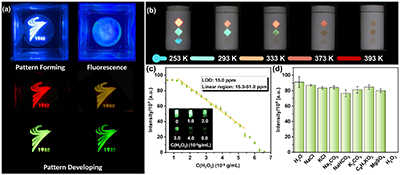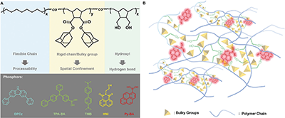 构建刚性环境是一种有效抑制有机生色团非辐射失活并产生长寿命RTP的成熟策略。然而,如何在高温下较好地保持聚合物网络的刚性依然具有挑战性。作者进一步通过可控共聚合成了一系列富含酯基的COP。酯基产生的偶极相互作用可有效抑制生色团的非辐射失活,从而实现辐照依赖的多色RTP。与物理掺杂的COP磷光材料相比,同等条件下,通过共聚手段所获得的COP磷光材料的室温磷光性能更为优异,推测是由于侧基的禁锢作用能够更好的作用于生色团。这些COP还能发射较强的HTP。对磷光热猝灭的研究表明,COP中环状骨架的空间限域效应可抑制酯基偶极相互作用的解离。通过进一步引入大体积金刚烷基团,成功实现了常见稠环生发色团在红、黄、绿光区域的HTP突破,且该性能在湿热环境下仍能保持。基于其辐照依赖性RTP与HTP特性,进一步将COP应用到了湿热环境成像、化学反应温度监测及过氧化氢检测等领域。
