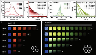 作者制备了一系列富含羟基的COP材料,将不同的有机磷光体掺杂到该COP中后,获得了一系列全彩辐照依赖性的RTP材料。这些COP基室温磷光材料不仅在水中能够产生持续稳定的发光,而且还展现了抗热淬灭的性能。尤其是,当磷光体为平面刚性结构的芘硼酸、芘、晕苯时,相应COP材料在370 K以上依然能够产生红色和绿色的余辉发射。