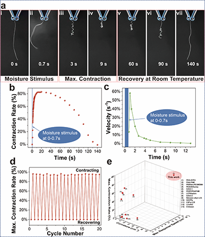 图3. Janus纤维驱动器的湿气响应性能。a)Janus纤维在0.7s湿气作用后的收缩及恢复过程;b)收缩率随时间的变化;c)收缩速度随时间的变化;d)循环稳定性测试;e)本研究驱动器的曲率、最大响应速度及最大收缩率与文献中已报道湿气驱动器的性能对比。