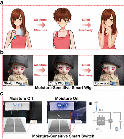 图5. 湿敏智能应用示例。a)湿敏智能假发示意图;b)由Janus纤维驱动器制备的湿敏智能假发;c)i, ii)环境湿度触发LED灯响应;iii)湿敏智能开关电路示意图。