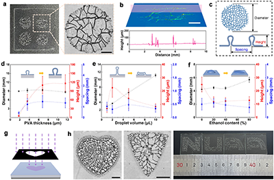 该水印图案的关键形成机理在于聚合物双层膜屈曲-分层现象的可控诱导。通过在PVA/PDMS表面滴加水或水-乙醇混合液滴,可诱导PVA层吸水膨胀,进而在界面产生压缩应力,触发屈曲-分层失稳,最终形成类叶脉状随机网状图案,溶剂蒸发后水印图案永久固定。具体而言,其形成机理在于PVA吸水膨胀受到PDMS弹性约束所引发的力学失稳,当应力超过临界值时,PVA层发生屈曲并与PDMS分层,形成具有“Ω”形截面的微脊结构。