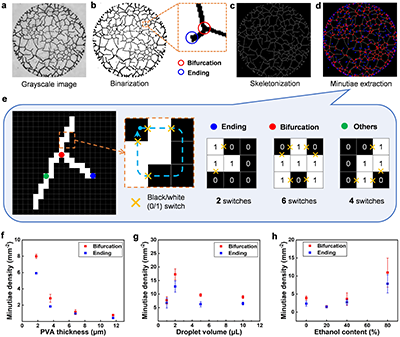 图3.PUF水印的特征点提取与分析。(a-d)水印图案中“指纹”特征点的识别示意图。(e)“指纹”特征点的识别判据。(f-h)水印图案特征点密度的调控。