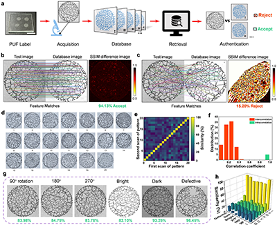 图4.PUF水印图案的认证流程与鲁棒性。(a)水印图案认证过程流程图。(b-c)计算机视觉特征匹配结果示例。(d-f)同一批次20个水印图案的相似度认证结果。(g, h)水印图案识别鲁棒性验证。
