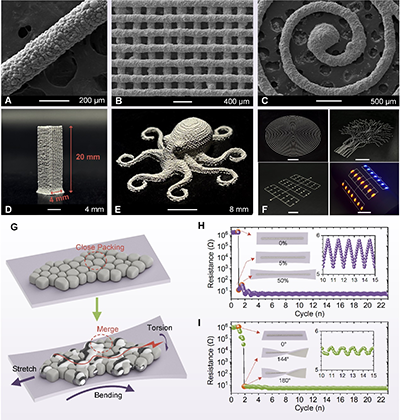 SALM-HIPE能够快速保持打印线条的形状,成为适用于高分辨率和纵横比的DIW 3D打印油墨,并成功打印出精细的3D结构。该系统中,异丙醇作为连续相迅速蒸发,显著降低了电激活的阈值。在外部机械刺激(如拉伸、扭曲或弯曲)下,液滴聚结并激活电导率。SALM-HIPE能够在平面上打印连续的导电路径,进一步证明了其在柔性电子设备设计中的广泛应用潜力。