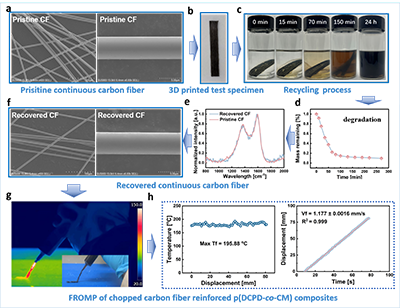 在回收过程中,c-CFRPs 复合材料经盐酸 / 甲苯溶液处理后,树脂基体降解为可溶性低聚物。这些低聚物保留了环戊烯官能团,能够与 DCPD 树脂重新混合后进行前端聚合,制备的再生材料固化度超过 95%,玻璃化转变温度与原始材料相当(约 120 °C)。回收碳纤维保持了完整的连续性和光滑表面形态,XRD 和拉曼光谱证实其结构未受降解过程影响。将回收碳纤维重新用于 3D 打印,制备的复合材料拉伸性能与原始碳纤维复合材料基本一致,实现了碳纤维的多次无损回收。