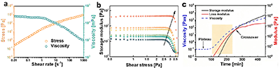 图4 DCPD 树脂的流变行为。(a) DCPD树脂的剪切变稀行为,(b)通过振荡流变测量测量树脂的粘弹性响应,以确定剪切应力,(c)打印树脂在22℃下的流变特性随时间的变化。