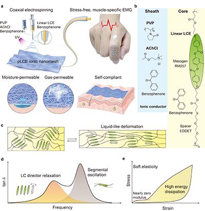 近期,该团队利用液晶弹性体的独特软弹性解决了离子皮肤透气性和自顺服性之间的性能矛盾。液晶弹性体(LCE)可在化学交联状态下通过液晶畴的自由转动耗散能量,这一过程几乎不产生内应力。因而,液晶弹性体可在保持孔道结构完整性的同时实现良好的自顺服性能。为此,他们利用同轴静电纺丝制备了以液晶弹性体为芯、离子导电水凝胶为鞘的超薄纳米纤维膜(厚度仅8微米)。作为离子皮肤,它即可通过芯层耗散界面应力,又可通过鞘层传输电荷,同时保持稳定的孔道结构以实现透气性。