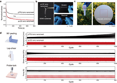此外,液晶弹性体的软弹性使得离子皮肤具有极为优异的自顺服性,可有效耗散皮肤形变产生的界面应力。离子皮肤对多种基底表现出极好的粘附能力,且在剥离、剪切、接触分离等多种动态破坏模式下保持稳定的粘附能力。作为对比,以热塑性聚氨酯(TPU)为弹性芯层的纳米纤维膜无法维持动态界面的粘附能力。