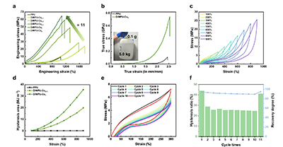 图2 DiMPU弹性体的卓越机械性能。(a) 不同浓度Cu配位下的DiMPU工程应力-应变曲线;(b) DiMPU-Cu1和PPU(未配位)的真应力应变曲线;(d-f) 循环拉伸回弹性能测试。