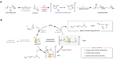 针对这一挑战,中国科学技术大学陈殿峰教授团队与上海交通大学朱峰教授团队合作,巧妙地将“质子转移”机制与钯催化相结合,开发了一种温和、高效的乙烯基氮杂环丙烷开环聚合新策略,通过配体调控的区域发散性烯丙基胺化反应实现对聚多胺微结构的精准调控(图1)。