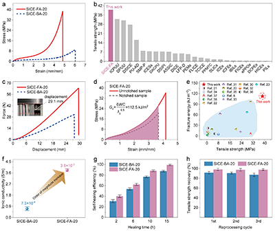 【图4:含氟离子弹性体SICE-FA-20及对照物的力学、自修复和再加工性】