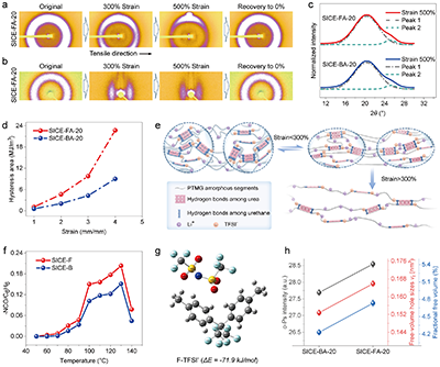 为了阐明拉伸强度、离子电导率和自修复性能同步提升的机理。作者通过原位和拉伸小角X射线散射,广角X射线衍射、原位变温红外光谱、正电子湮灭寿命谱、密度泛函理论计算等手段进行深入研究。结果表明:小应变下(<300%),小而密集的纳米硬域结构稳定,可起到类似刚性纳米填料的作用,提高力学强度、耐损伤和抗穿刺性;大应变下(>300%),纳米域发生变形并进一步解离耗散能量,同时分子链被取向并伴随软段的拉伸诱导结晶,从而提升材料的韧性。原位变温红外则证实了氟化的酚氨酯键具有更低的解离温度和更高的解离率和速率,有效提高自修复性能。更为重要的是,氟化基团不仅可通过与固态锂盐中阴离子形成非共价相互作用促进锂盐解离,加快锂离子的传输;还能降低材料的玻璃化转变温度,增强聚合物链运动能力,提高离子电导率。