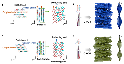 图1:I型纤维素和II型纤维素的纳米手性及介观手性。(a, b)从左至右分别在xy、zx和zy平面显示I型纤维素分子链平行排列(a)以及右旋CNC-I自组装形成的左旋手性向列型结构(b)。(c,d)从左至右分别在xy、zy和zx平面显示II型纤维素分子链反平行排列(c),以及左旋CNC-II自组装形成右旋手性向列结构(d)。