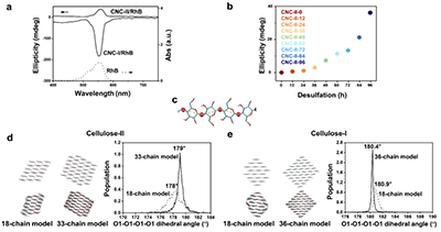通过实验与分子动力学模拟共同证实了CNC-II的左旋纳米手性。图3a显示,CNC-II与CNC-I均具有诱导染料Rhodamine B产生诱导圆二色性信号的能力,但诱导圆二色信号相反,表明两者具有相反的纳米手性。CNC-II的诱导圆二色信号强度随脱硫程度增加而增强(图3b),表明纳米手性随脱硫程度提高而增加。分子动力学模拟显示单根II纤维素纳米晶呈左旋扭转(图3c, d),说明晶体聚集并未改变纳米手性,相反,聚集导致手性放大,与实验结果相一致。同样的分子动力学模拟显示CNC-I呈右旋纳米手性,以此证明分子动力学模型的可信度(图3a, e)。