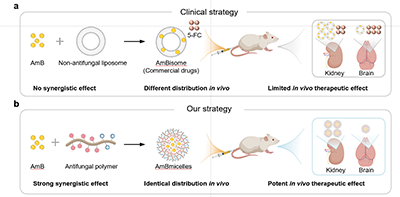 随着真菌耐药性日益增强,经典单一药物治疗方案疗效往往不足甚至失败。具有协同效果的两种药物组合具有比单一药物更高疗效,尤其在耐药性和难治性感染治疗中表现出强大的潜力。尽管如此,真菌系统性感染,尤其是真菌脑膜炎,临床上依然显示高死亡率。主要是由于抗真菌药物协同组合本身非常有限,更重要的是,两种药物不同的药代动力学和体内分布导致难以在体内感染部位实现体外的协同效果。因此急需实现体内协同治疗耐药真菌感染的有效策略。
