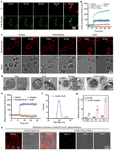图3:聚合物胶束与AmB的协同抗真菌机制以及聚合物胶束的病原体靶向作用。