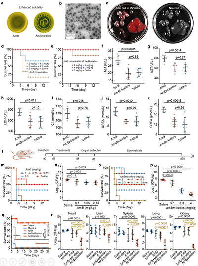 随后对包载了AmB的胶束(AmBmicelles)的体内毒性进行了测试,结果表明,胶束的包载将AmB的最大耐受剂量由1 mg/kg提高到6 mg/kg。连续四天单次注射后,AmB在1 mg/kg的浓度下表现出显著的肝肾毒性,而胶束包载的AmB在4mg/kg浓度下,没有明显的肝肾毒性。在真菌的系统感染实验中,胶束将AmB的有效治疗窗口由原来的0.65-0.75 mg/kg拓展至0.1-4 mg/kg。并且相同的治疗浓度下,AmBmicelles组的治疗效果显著优于AmB组,表现出优异的体内治疗效果。