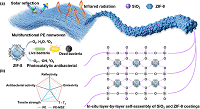 闪蒸纺聚乙烯(PE)非织造布具有卓越的抗拉强度和耐磨性,但缺乏固有的辐射冷却和抗菌特性,这限制了其在高温和生物要求严苛环境中的应用。研究人员开发了一种多功能聚乙烯非织造布(PE-MSZ),通过共辐射接枝方法将γ-甲基丙烯酰氧基丙基三甲氧基硅烷(MAPS)接枝到PE纤维上,然后原位层层沉积二氧化硅(SiO2)与沸石咪唑酯框架-8 (ZIF-8)涂层,实现了被动辐射制冷与光催化抗菌功能的集成。这种分级微纳米结构赋予PE-MSZ高太阳光反射率(90.8%)和强中红外发射率(93.5%),使其在阳光直射下较传统PE降温约4.5℃。此外,PE-MSZ展现出卓越的光催化抗菌效能,在模拟太阳辐射条件下120分钟内可实现大肠杆菌和枯草芽孢杆菌99.9%的抗菌率。该改性非织造布同时保持高抗拉强度(28.1MPa)、优异耐磨性、良好耐洗性和透气性,将卓越的辐射冷却与抗菌功能相结合,展现出在可穿戴设备、建筑集成及新一代多功能纺织品领域的巨大应用潜力。