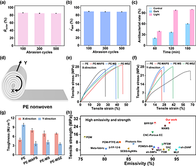进一步评估了PE-MSZ的耐磨与洗涤稳定性,在耐磨500次循环和洗涤5次循环后,PE-MSZ仍表现出较高的光学性能和光催化抗菌性能。PE-MSZ非织造布在X方向和Y方向上具有28.1 MPa和25.2 MPa的拉伸强度。