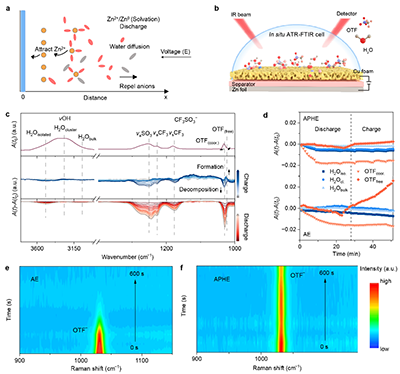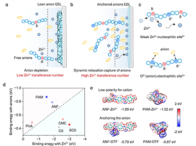 该研究报道了一种具有正相对阴离子亲和力的亲阴离子聚合物电解质。通过引入弱吸附阳离子的聚合物主链和强吸附阴离子的另一条聚合物链,削弱了Zn2?的阳离子-偶极配位作用,从而促进盐的解离并限制阴离子的迁移。该聚合物电解质设计理念通过使用聚丙烯酰胺和芳纶纳米纤维得以验证。制备的亲阴离子聚合物水凝胶电解质(APHE)有效抑制了析氢反应(HER),形成了薄且强附着性富无机物固态电解质界面(SEI)。该亲阴离子聚合物电解质还展现出高Zn2+迁移数(0.71),使得Zn0.25V2O5||Zn(30 μm)软包电池(4.9 mAh cm-2)在超过270次循环后仍能实现高度可逆性。