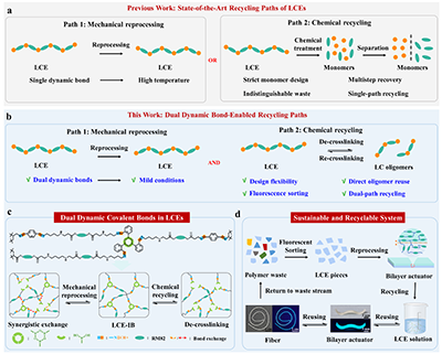 在全球塑料污染日益严峻、“双碳”战略加速推进的时代背景下,高分子材料的可持续性已不仅是环境保护的迫切需求,更成为决定下一代智能软材料能否真正走向实用化与规模化的核心前提。作为一类巧妙融合液晶分子有序性与聚合物网络弹性的智能软材料,液晶弹性体(Liquid Crystal Elastomers,LCEs)凭借可编程形变、光/热响应驱动等独特能力,正迅速成为柔性电子、智能传感、人工神经元和软体机器人等前沿领域的关键功能平台。然而,传统LCE依赖不可逆的永久共价交联网络来维持其结构完整性与响应性能,一旦成型,便难以重塑和回收。这意味着,越是精密复杂的LCE器件,越可能沦为难以降解的高分子废弃物。因此,在不牺牲其多功能特性的前提下,构建可循环的LCE体系,开辟一条“用之能智、废之可归”的材料新路径,已成为推动下一代智能软材料迈向绿色制造与循环经济的关键挑战。