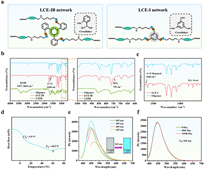 图2 (a) 双动态共价 LCE-IB(左图)的结构对比,其包含亚胺键和硼氧烷键,而单动态共价 LCE-I(右图)仅包含亚胺键。(b) LCE-IB 的傅里叶变换红外光谱。(c) LCE-I 的傅里叶变换红外光谱。(d) LCE-IB 在第二次加热循环过程中的 DSC 曲线。(e) 不同激发波长(Ex)下 LCE-IB 的荧光光谱。(f) 将 LCE-IB 存放在常温环境中不同天数后(在 365 纳米处激发)的 LCE-IB 的荧光光谱。