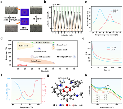 图3 (a)LCE-IB的可逆驱动性能;(b)LCE-IB 的可逆驱动循环;(c)LCE-IB与LCE-I在固定编程时间(10 min)下,驱动应变随编程温度的变化;(d)LCE-IB与文献报道的其他动态共价LCE体系在编程温度与时间上的对比;(e)LCE-IB与LCE-I在40?°C下的应力松弛行为;(f)LCE-IB的动态力学分析结果;(g)LCE-IB中动态交联点的DFT优化分子构型;(h)LCE-IB的变温红外光谱。