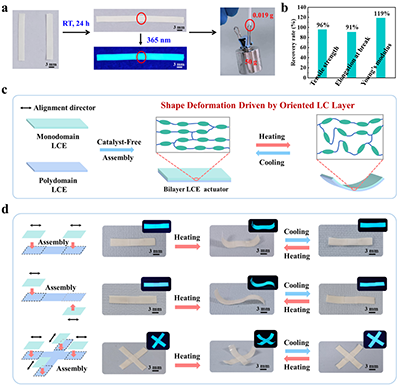 图4 (a)两条LCE-IB带在室温下经过24小时后成功组装成一个整体;紫外光下可直观识别潜在损伤;组装后的样品可提起50g重物(为其自身重量的2600余倍);(b)LCE-IB薄膜经无催化剂重新组装后的力学性能恢复率;(c)双层LCE-IB驱动器的结构设计示意图及热致弯曲形变机制;(d)LCE-IB薄膜组装方式示意图(左)及所制备的多种构型驱动器在可见光与紫外光下的实物照片(右)