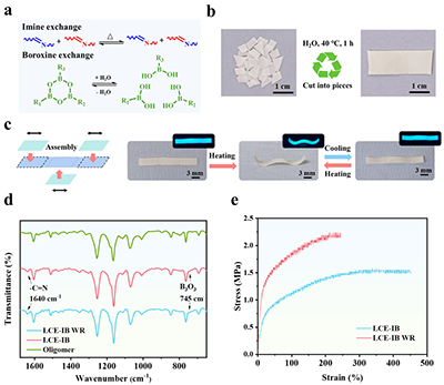 图5 (a)网络中亚胺键与硼氧烷键的动态交换机制示意图;(b)回收过程展示:碎片原料(左)经40°C重物压1小时后重构成完整薄膜(右);(c)基于再加工LCE-IB薄膜制备驱动器的流程示意图(左)及驱动器在可见光与紫外光下的工作状态照片(右);(d)原始LCE-IB薄膜与再加工样品的红外光谱对比;(e)原始与再加工LCE-IB薄膜的应力–应变曲线对比。