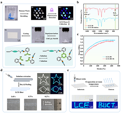 图6 (a)上:LCE-IB在混合塑料中通过本征荧光实现识别分选,并经室温溶解-再成膜完成化学回收的实物照片;下:化学回收过程中LCE-IB网络结构演变的示意图;(b)原始LCE-IB薄膜与化学回收所得溶液的红外光谱对比;(c)原始LCE-IB薄膜与化学回收样品的应力-应变曲线对比;(d)回收LCE-IB纤维及其功能展示:上左为纤维制备示意图;上右为由回收纤维编织的织物图案(日光下可见,紫外光下荧光);下图为基于回收纤维构筑的驱动器实物照片;(e)回收LCE-IB溶液的直写加工:上图为溶液直写过程示意图;下图为所制备“LCE”和“BUCT”图案在日光与紫外光下的效果。
