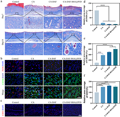 体外细胞实验显示,该水凝胶能够有效引导巨噬细胞向抗炎、促修复的M2表型极化,同时抑制成纤维细胞向过度活化的肌成纤维细胞分化,表明该材料具备协调炎症消退与抑制异常纤维化的双重调控能力。在大鼠全层皮肤缺损模型中,该水凝胶展现出显著的促愈合效果:一方面通过促进血管化肉芽组织生成与上皮再生加速创面闭合;另一方面通过时序释放药物有效抑制胶原的过度沉积与排列紊乱,从而显著减轻瘢痕形成(图4)。