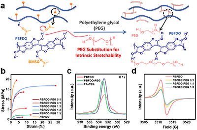 图1 a) 聚乙二醇(PEG)替代溶剂对PBFDO进行塑化的示意图。b) 不同PEG固含量下自支撑PBFDO-PEG薄膜的应力-应变曲线。c) PBFDO薄膜、PBFDO-PEG薄膜及FA-PEG薄膜的XPS(O 1s)光谱。d) PBFDO薄膜及不同PEG固含量的PBFDO-PEG薄膜的EPR谱图。